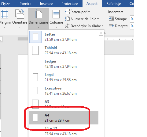 - De la meniul Aspect Pagină alegem caseta Inițializare Pagină butoanele Dimensiune, Orientare, Margini apoi margini particularizate.