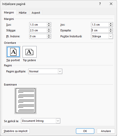 - Formatați pagina A4 cu margini de 2,5 cm stânga, 1,5 cm sus și jos și 1 cm dreapta apoi închideți documentul.