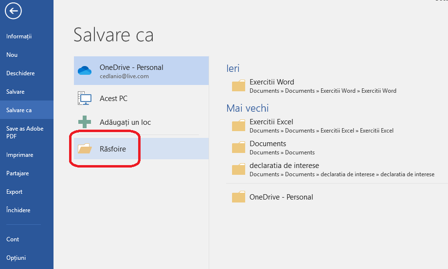 - De la meniul Fișier alegem Salvare ca și apoi alegem folderul în care facem salvarea.